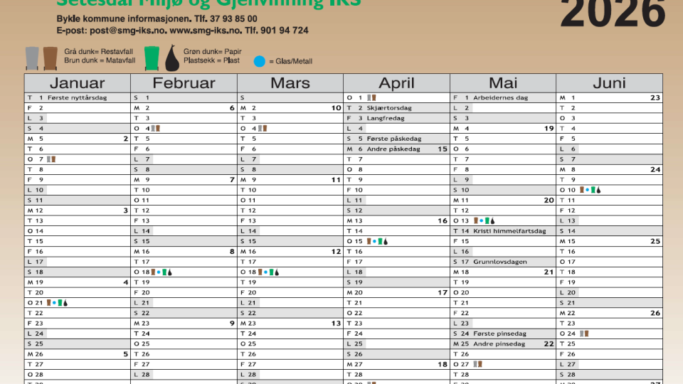 Tømmekalender for 2026 No har kalender for søppeltømming i 2026 kome.Tømmekalender for Bykle 2026 (PDF, 2 MB)Sjå sida til Setesdal miljø og gjennvinning for tømmekalender i ...