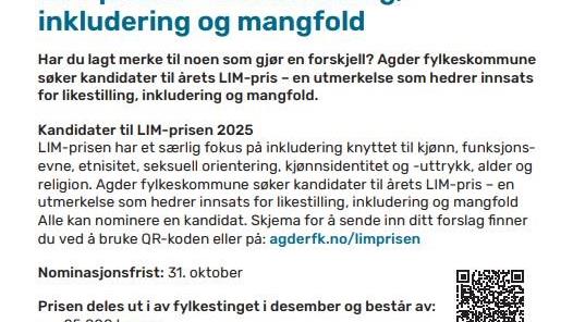 Nominasjonsfrist til LIM-prisen er 31. oktober LIM-prisen for likestilling, inkludering og mangfald blir delt ut av Agder fylkeskommune kvart år. Fristen for å nominere ein kandidat er 31. oktober.