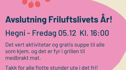 Avslutning på Friluftslivets år på Hegni fredag 5. desember Friluftslivets år blir avslutta med ein samankomst på Hegni på Hovden fredag 5. desember klokka 16.