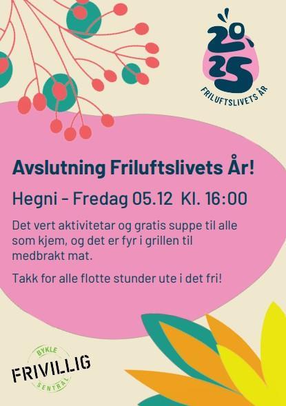 Friluftslivets år blir avslutta med ein samankomst på Hegni på Hovden fredag 5. desember klokka 16.