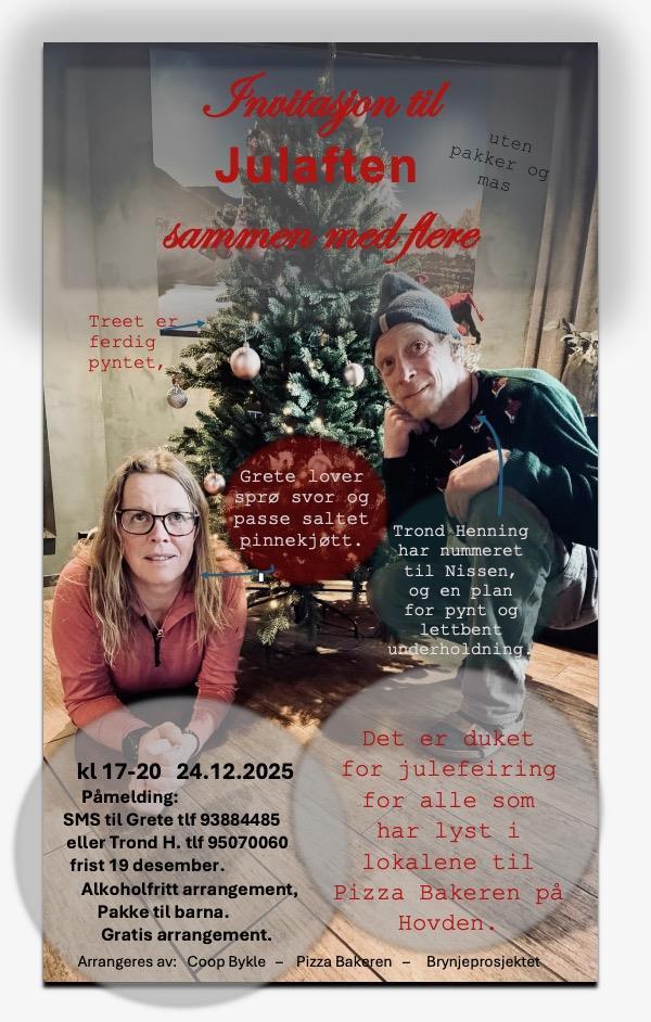 Jolaftan mellom klokka 17-20 kan alle som vil det kome til lokala til Pizzabakeren på Hovden og feire jol saman med andre. Det er verksemda og Brynje-prosjektet i Bykle kommune som står bak arrangementet.