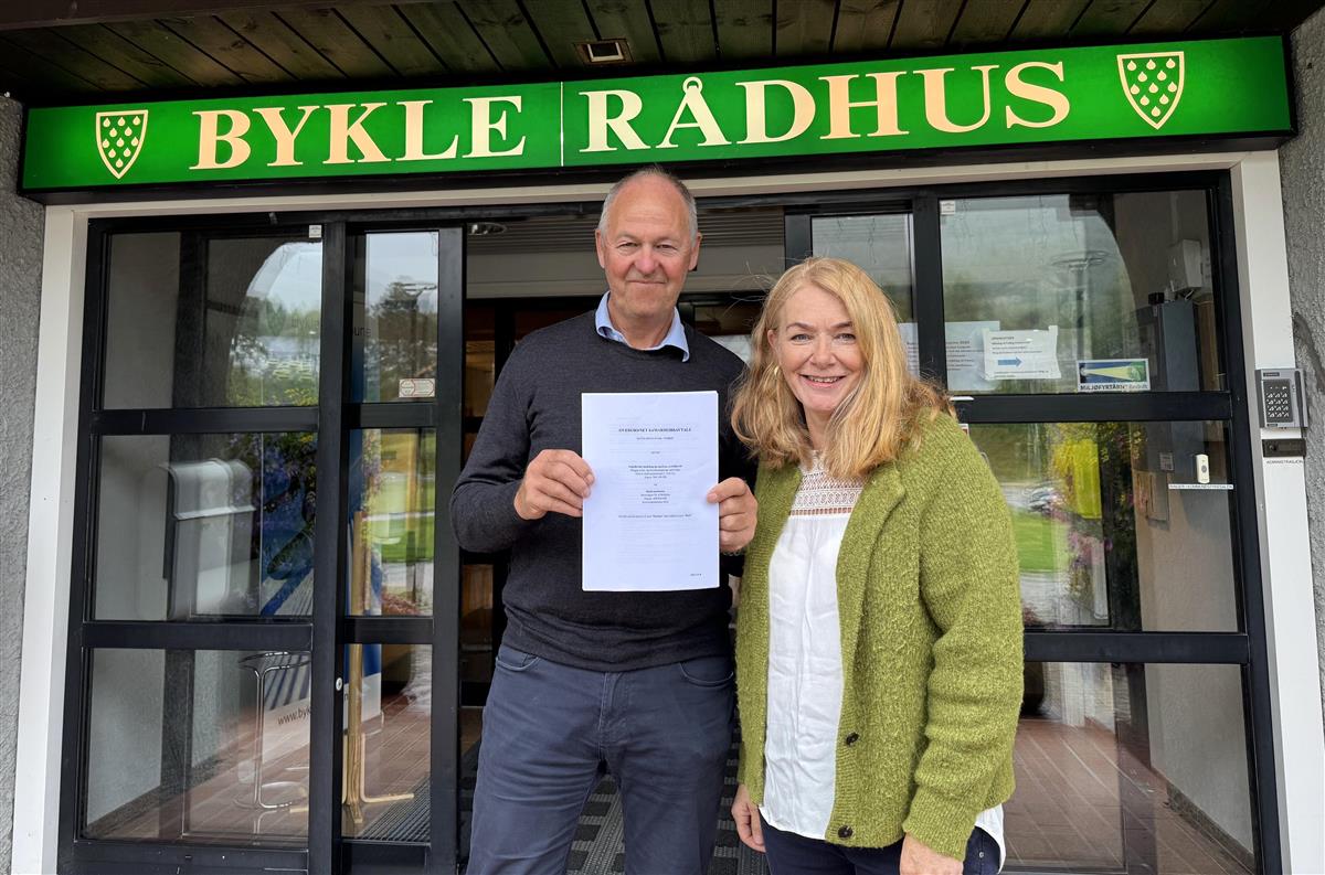 Bykle-ordførar Hans Blattmann og plansjef Signe Sollien Haugå med samarbeidsavtalen kommunen har inngått med Norges miljø- og biovitenskaplige universitet i Ås.