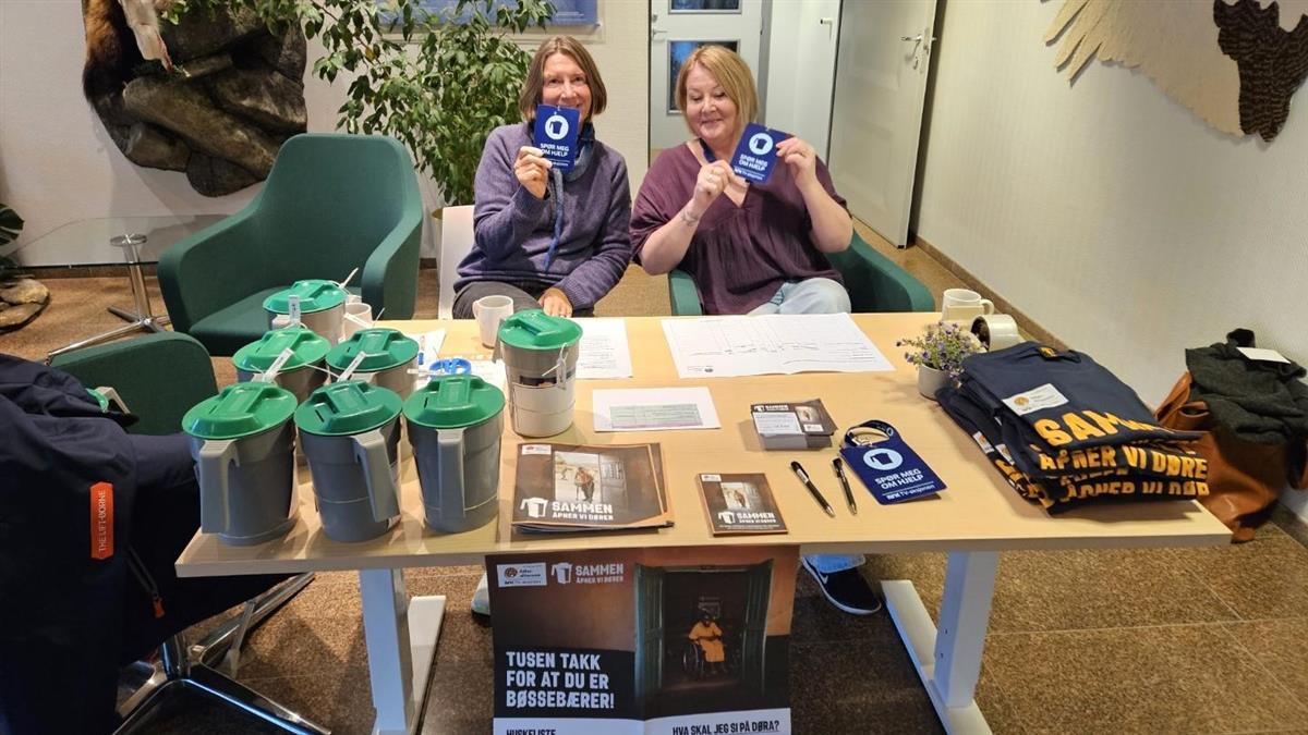 Anja Holmeide (t.v.) og Monica Wathne delte ut og tok imot bøsser.