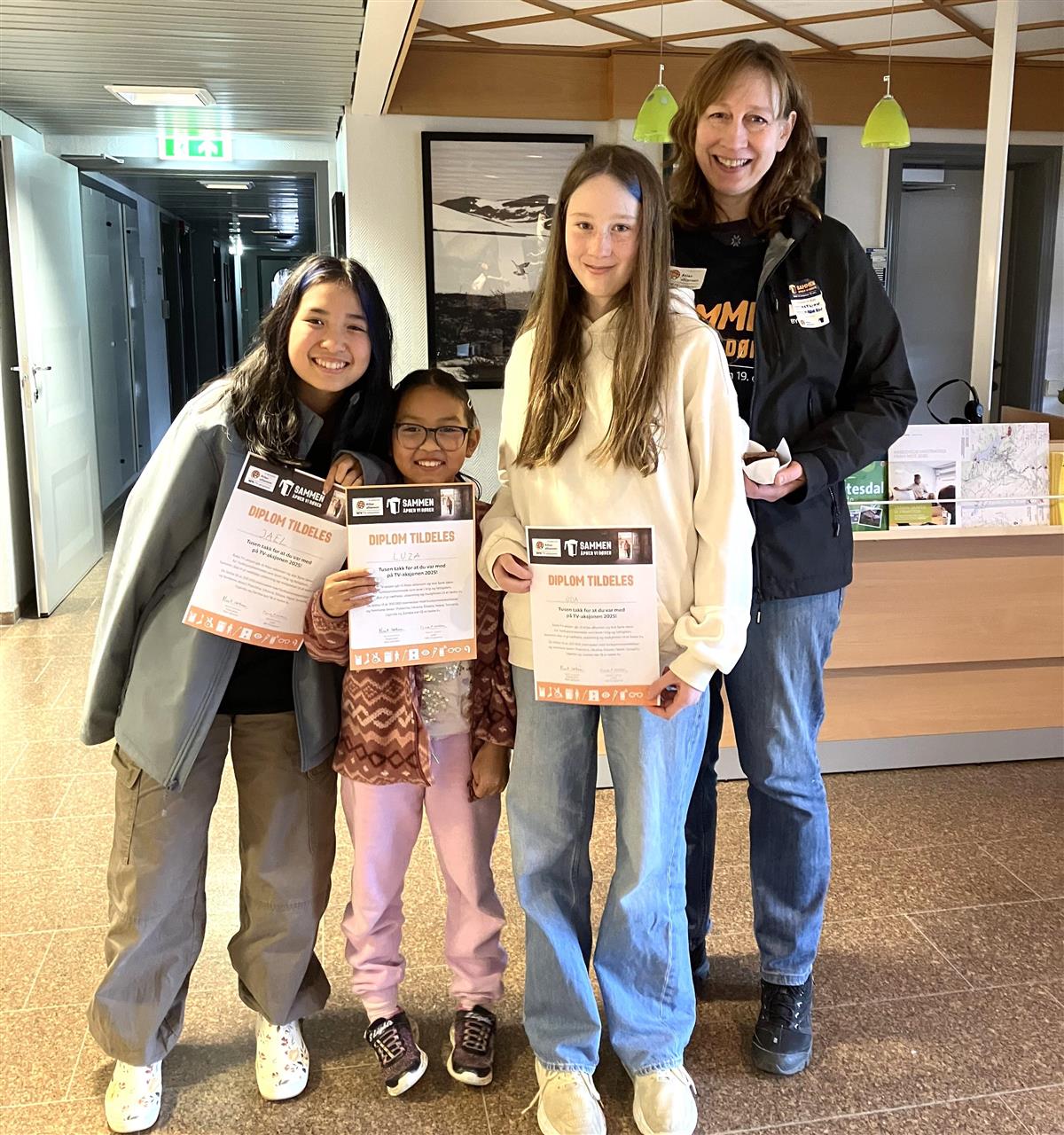 Eit knippe av dei mange frivillige i Bykle sundag. Frå venstre: Luza Sein, Jael Sein, Oda Haugen og May Linn Haugen.
