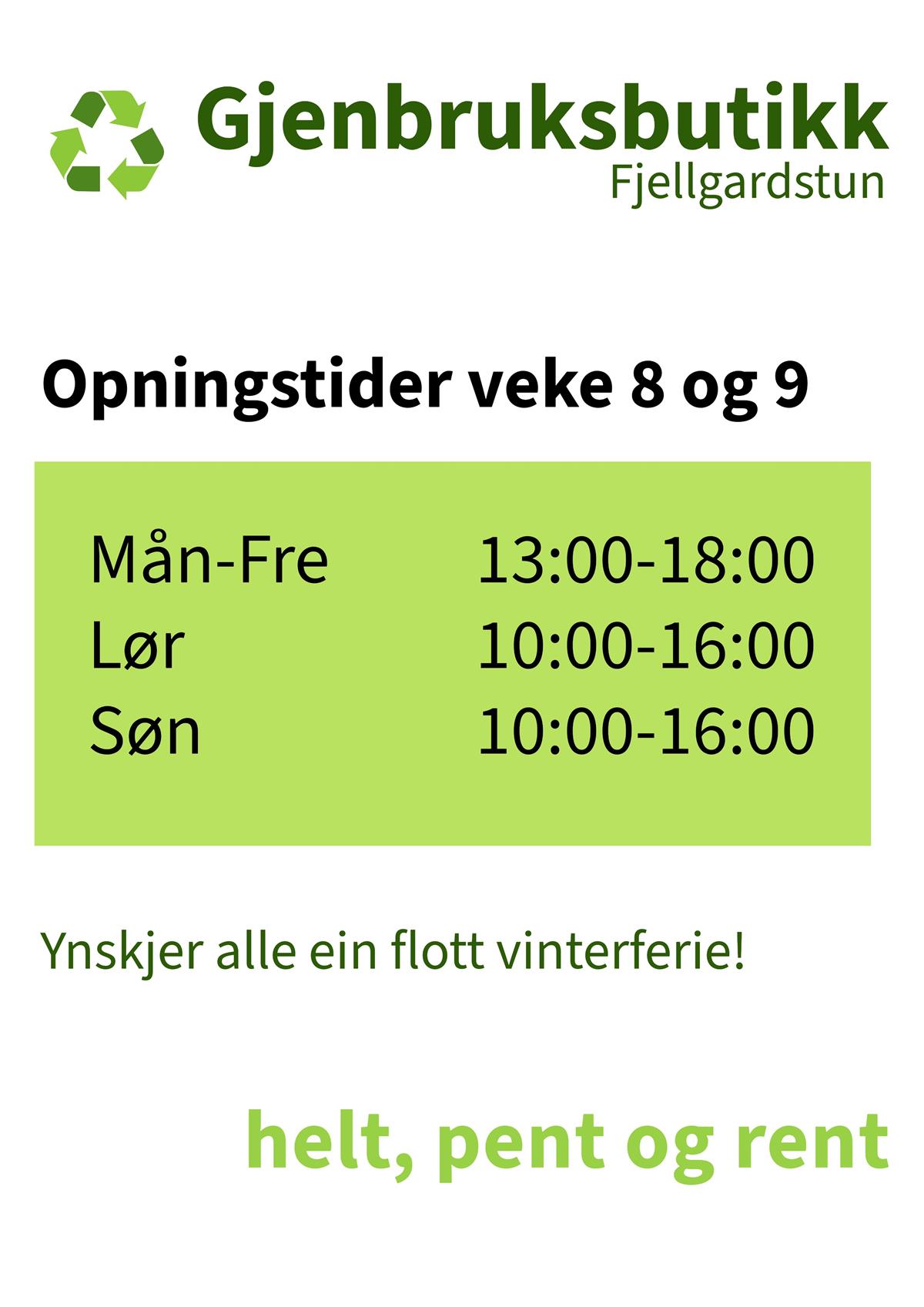 Måndag til fredag er opningstida 13-18, laurdag 10-16 og sundag 10-16.