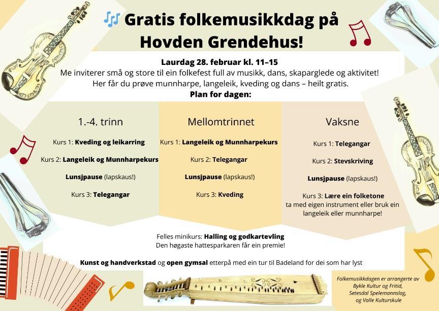 Store og små blir inviterte til ein folkefest med musikk, dans, skaparglede og aktivitet! Her kan ein få prøve seg på alt frå munnharpe til langeleik, kveding og dans - og aldeles gratis! Det er delt inn i kursgruppe for 1.- 4. klassesteg, mellomtrinnet og vaksne. Det blir kursing i alt frå kveding til munnharpe og Telegangar, og mykje meir.