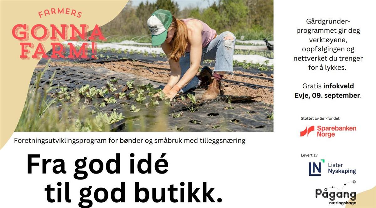 Forretningsutviklingsprogrammet Gårdgründerprogrammet skal settast i gang med mogelegheit for deltaking frå bønder her i distriktet, og det blir skipa til gratis informasjonskveld på Evje folkehøgskule tysdag 9. september klokka 18.