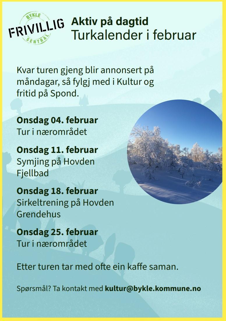 I dag er det tur i nærområdet som står på programmet. Onsdag 11. februar er det symjing i Hovden Fjellbad, onsdag 18. februar sirkeltrening i Hovden grendehus og onsdag 25. februar tur i nærområdet.