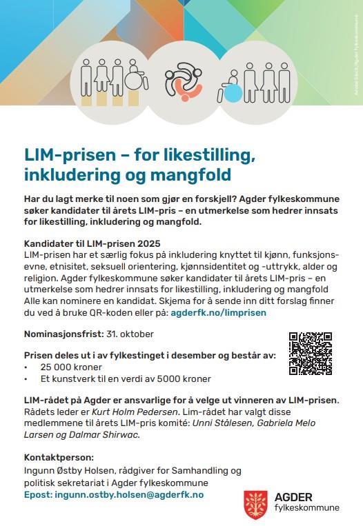 LIM-prisen for likestilling, inkludering og mangfald blir delt ut av Agder fylkeskommune kvart år. Fristen for å nominere ein kandidat er 31. oktober.