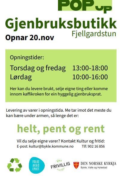 Det opnar ein mellombels gjenbruksbutikk på Fjellgardstun (Ved Pizzabakeren) på Hovden frå 20. november til 15. januar. Seljarar kan kome med tinga sine alt frå måndag 17. november. Bak initiativet står Folkeakademiet Bykle, Bykle sokneråd og Bykle frivilligsentral, og med tilskot frå Valle Sparebank.