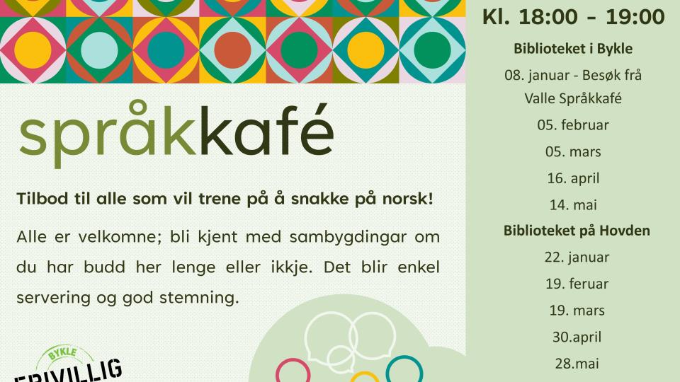 Språkkafé startar opp torsdag 8. januar Vinter- og vårprogrammet for Språkkafé er no klart, med oppstart i Bykle bibliotek torsdag 8. januar klokka 18.