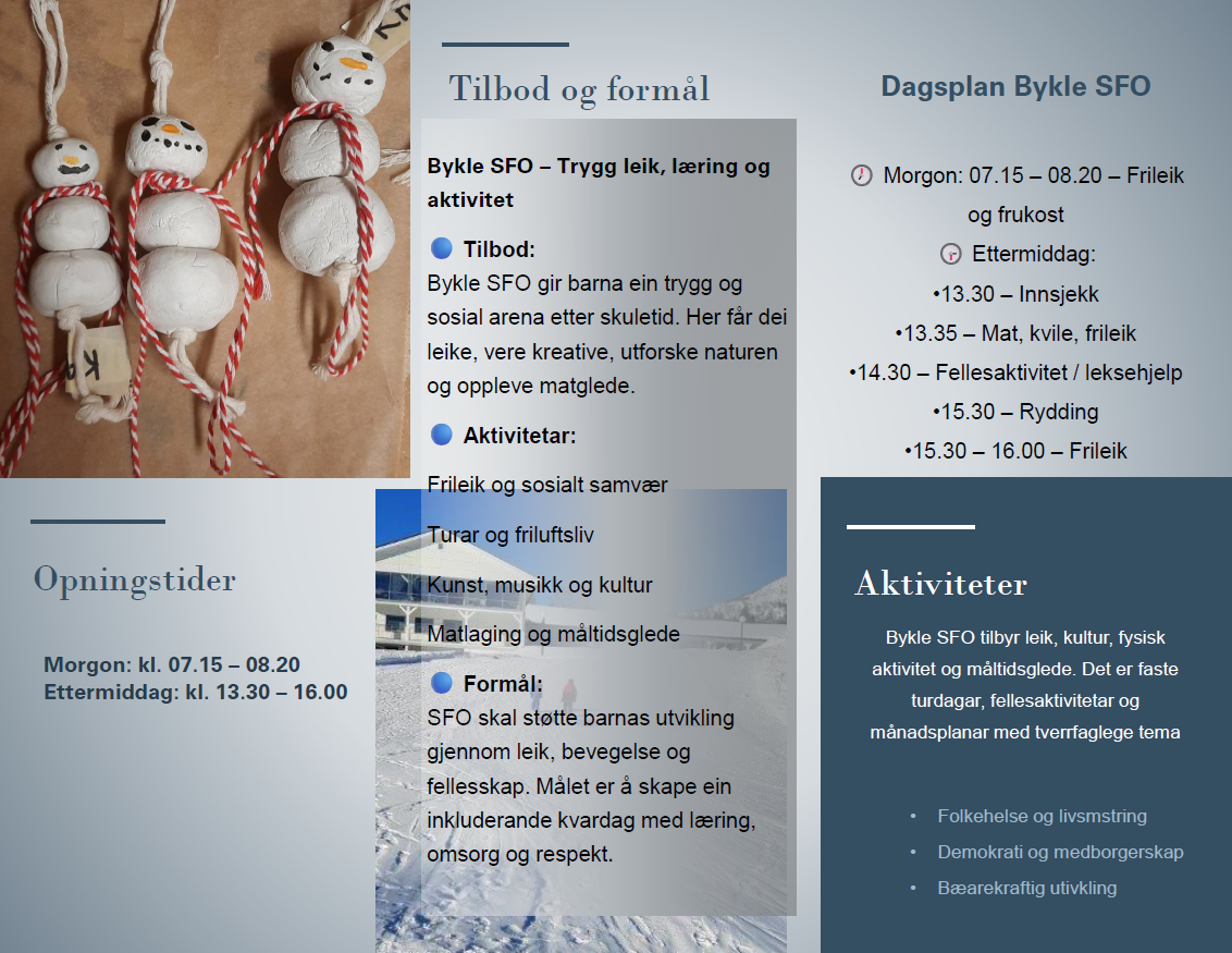 Skulefritidsordninga ved Bykle skuleLytt til tekstenStopp avspillingSFO skal fremje den fysiske og psykiske helsa til barna og bidra til at dei opplever glede og meistring. SFO skal støtte utviklinga av trygge og gode relasjonar barna imellom, mellom barna og personalet og mellom personalet og foreldra til barna. SFO skal fremje inkludering og bidra til at alle barna har moglegheit til å utvikle vennskap. Barna skal få støtte til å meistre motgang, handtere utfordringar og bli kjende med eigne og andre sine kjensler. Barna skal ha moglegheit til både aktivitet og kvile i løpet av tida dei er i SFO.Vedtekter for SFO i Bykle kommune Rammeplan for SFO Årshjul for SFO 2025-2026 (PDF, 191 kB)Dagsplan Bykle SFO🕖 Morgon:• 07.15 – 08.20 – Frileik og frukost🕞 Ettermiddag:• 13.30 – Innsjekk• 13.35 – Mat, kvile, frileik• 14.30 – Fellesaktivitet / leksehjelp• 15.30 – Rydding• 15.30 – 16.00 – Frileik Tilsette ved Bykle SFO:Lars Erik Domaas, rektorBrigitte Haugen, fagleiar SFO Mette Dale, fagarbeidar + skulekantineAnn-Katrin Bakke, fagarbeidarIngunn Skogheim, fagarbeidar Kontakt: Lars Erik Domaas, rektor, Telefon: 95 77 58 88Brigitte Haugen, fagleiar SFO Telefon: 95 90 59 84 SFO mobil: 48 07 53 35 Publisert 26.01.2024 13:23 Sist endret 02.09.2025 12:59